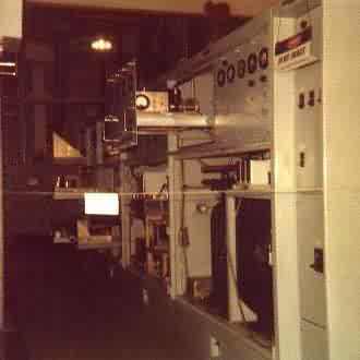 The 26A transmitter, rear view. The units shown are 34/35/36 and 36 alone. Moving right to left unit 34 exposes the upper tray containing the assembly housing the backward wave oscillator (BWO). The BWO generated the 5.4 to 5.9 GHz operating frequency of the transmitter. The lower part of the photo shows a cooling fan. The output from unit 34 was coupled to 35. Unit 35 was referred to as the driver cabinet and contained a microwave amplifier called a traveling wave tube (TWT). You can see two chassis assemblies as well as another cooling fan. The TWT amplified the output from the BWO and coupled the signal to unit 36. Unit 36 provided final amplification of the transmitter signal and was called the power amplifier stage. The second photo of this set shows unit 36 or the power amplifier stage. Unit 36 provided amplification through the use of a high power klystron tube (shown in red on the right side of the photo). The upper portion of the klystron can be see, the lower half is sitting inside the focus coil assembly. Both the klystron and focus coil assembly and bolted to the top of a pulse transformer (black area) which provided a high-voltage pulse to the cathode of the klystron. The process of producing RF energy at high power levels is a little more detailed than I am describing. I remember the klystron as bring manufactured by Varian and worth about $10,000. at the time. We could usually get 12 to 18 months of use from one until the power output began to drop below an acceptable level of about 2 Mw (2,000,000 watts). A klystron could be removed and replaced in a couple of hours. The pulse transformer was different. The thing weighed about 1000 pounds and took several maintenance techs several hours to safely remove and replace. A track system with chain hoist was bolted to the ceiling above each transmitter. It was used in the removal and replacement of the heavy items. A cooling fan and holding tank for insulating oil for the transformer can also be see. Front panel meters and wiring can also be seen on the far side of the cabinet. |