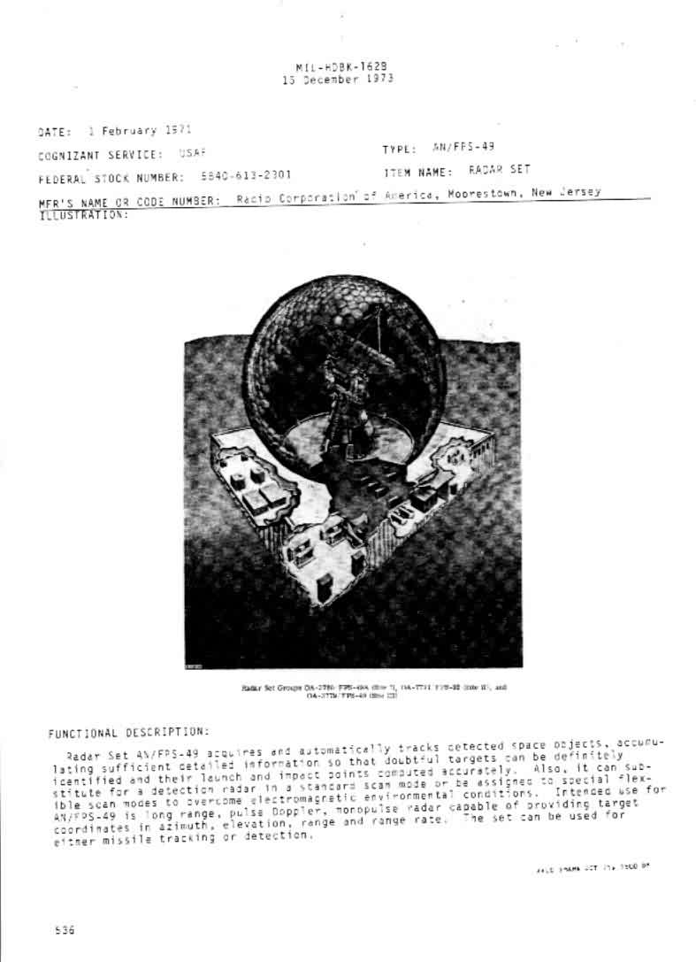 RCA was prime contractor for this large radar for use in the BMEWS program and the satellite-tracking program that deployed in the 1960s. The antenna was built by Goodyear in Akron, Ohio. The prototype unit operated at Moorestown, New Jersey.Production units were installed in Greenland, Alaska and England. The radar frequency operated in the Ultra High Frequency (UHF) 2-meter band (just outside the amatuer radio band) and could track objects beyond 3,000 miles.