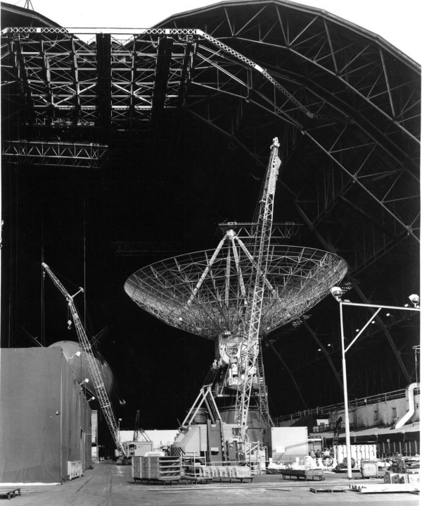 An FPS-49 antenna under construction in one of the Goodyear blimp hangars at Goodyear in Akron, Ohio. The elevation pivot center is approximately 47 feet off the floor.
