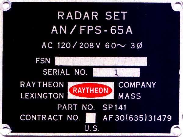 The serial number plate of the AN/FPS-65 at the Verona Test Site. Note serial # 1.