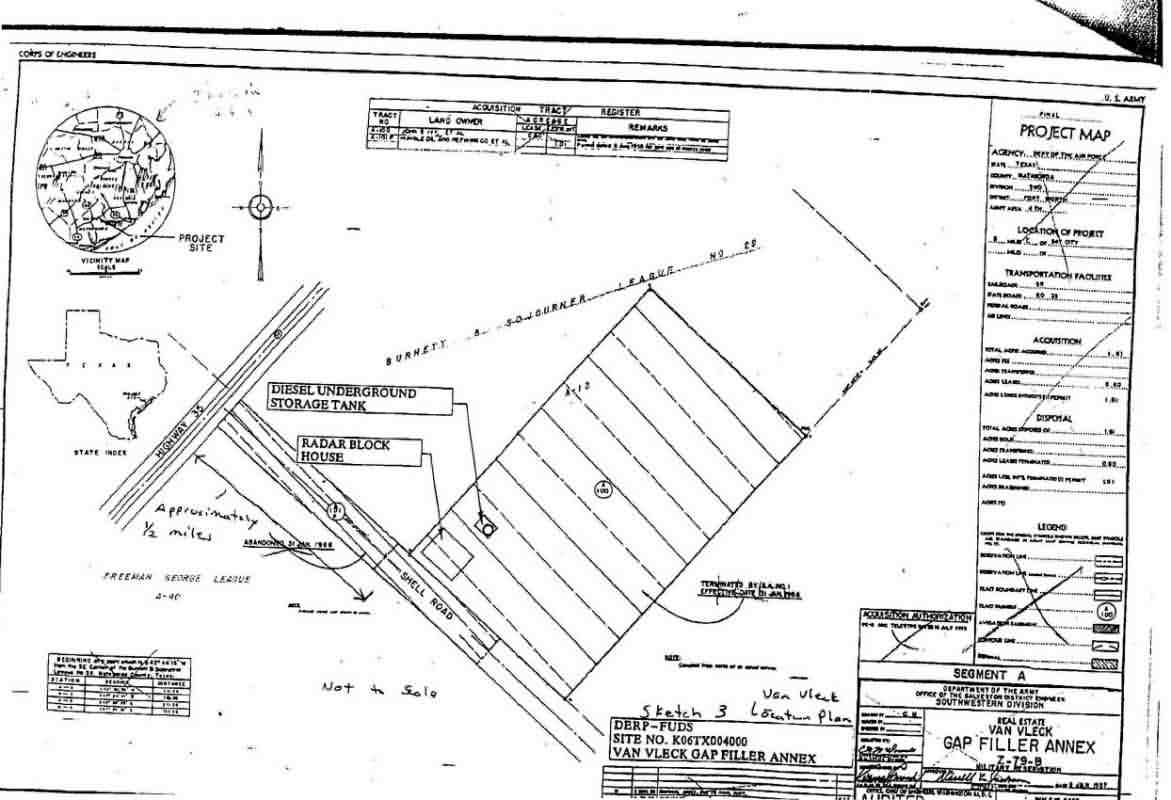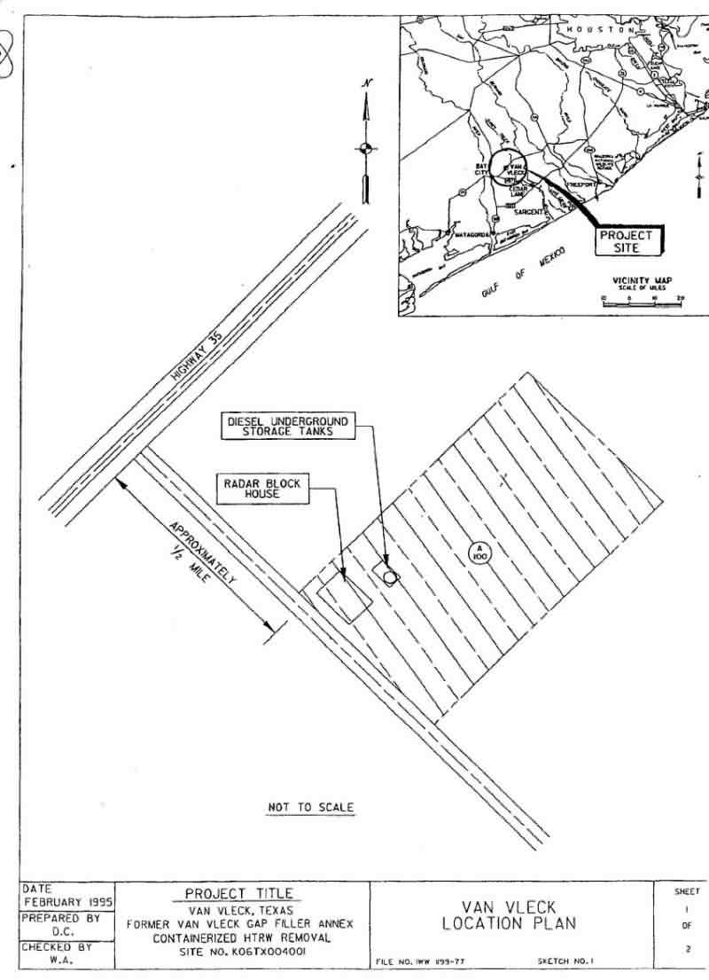 On access road, 0.5 mile east of Highway 35 near Van Vleck, Matagorda County, TX. Access road use was acquired from the Humble Oil refining Company, and the 0.60-acre property was leased from a Mr. John S. Ivy.