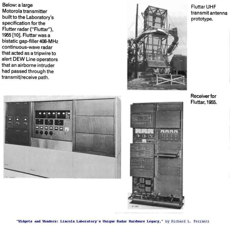 The AN/FPS-23 DEW-Line radar system was manufactured by Motorola, and operated at frequencies between 475 and 525 MHz, with 1 kilowatt of output power. AN/FPS-23 radars were continuous-wave (CW) systems that were comprised of geographically-separated AN/FPT-4 Fluttar Transmitters and AN/FPR-2 Fluttar Receivers. AN/FPT-4 Fluttar Transmitters were located only at Intermediate ("I") Sites, while AN/FPR-2 Fluttar Receivers were located only at Main and Auxiliary Sites. The transmitters and receivers were typically about fifty miles apart. The function of this Doppler-effect detection system was to fill the low-altitude gaps between AN/FPS-19 radars located at Main and Auxiliary DEW-Line Sites.