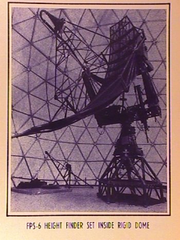 The FPS-6 radar is capable of height determination of targets flying between elevation angles of - 2 and +32 degrees for any azimuth through-out 360 deg. The transmitter develops a peak power of 5 Megawatts at a frequency range of 2.7 to 2.9 GHz. The pulse width is 2 usec at a PRF of 400 PPS. Maximum indication range is 200 nautical miles with height measurement capability to 75,000 feet. Both ranges are readily expandable. Data is displayed on two 12 RHI indicators and mechanical counter assemblies. The antenna type is a truncated semiparabolic reflector with associated waveguide feed sections. Input power requirements are 208V, 30, 60 Hz. This radar is also suited for very high power search functions.